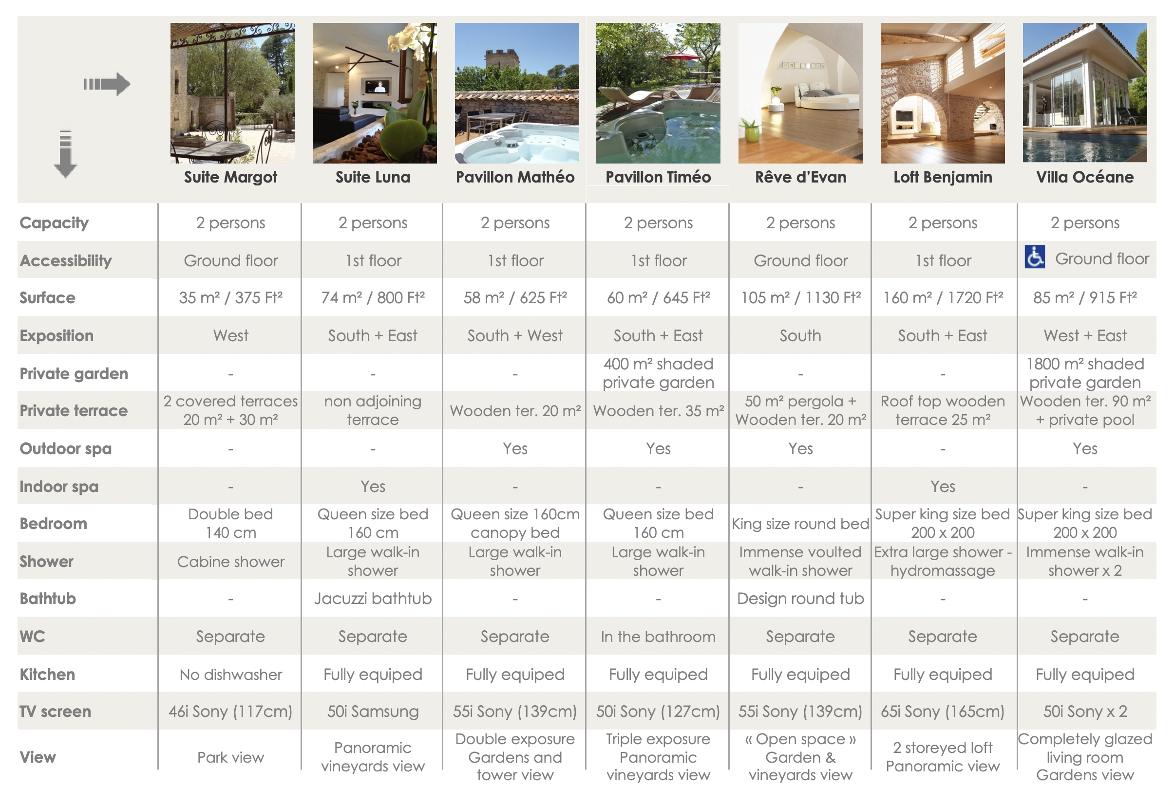 - Home Theatre : DVD/CD, Bluetooth or smartphone dock (except Suite Margot), USB.